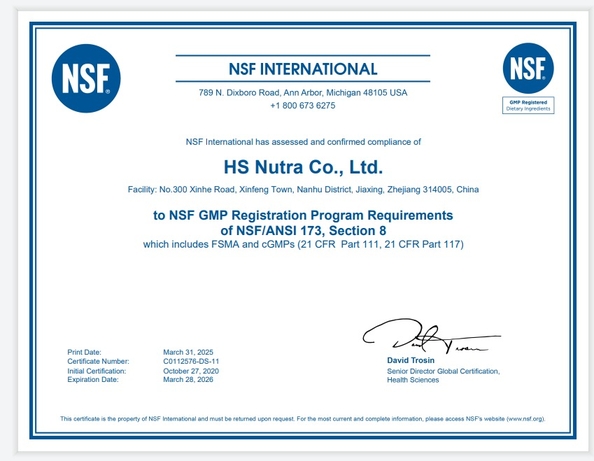 우리는 고객에 대한 순위 갱신으로서의 품질을 두었습니다. 우리는 NSF-GMP 가이드라인에 따라 품질 경영 시스템을 확립했습니다. 우리의 생산설비와 제품은 품질 보증서 아래에 받았습니다.